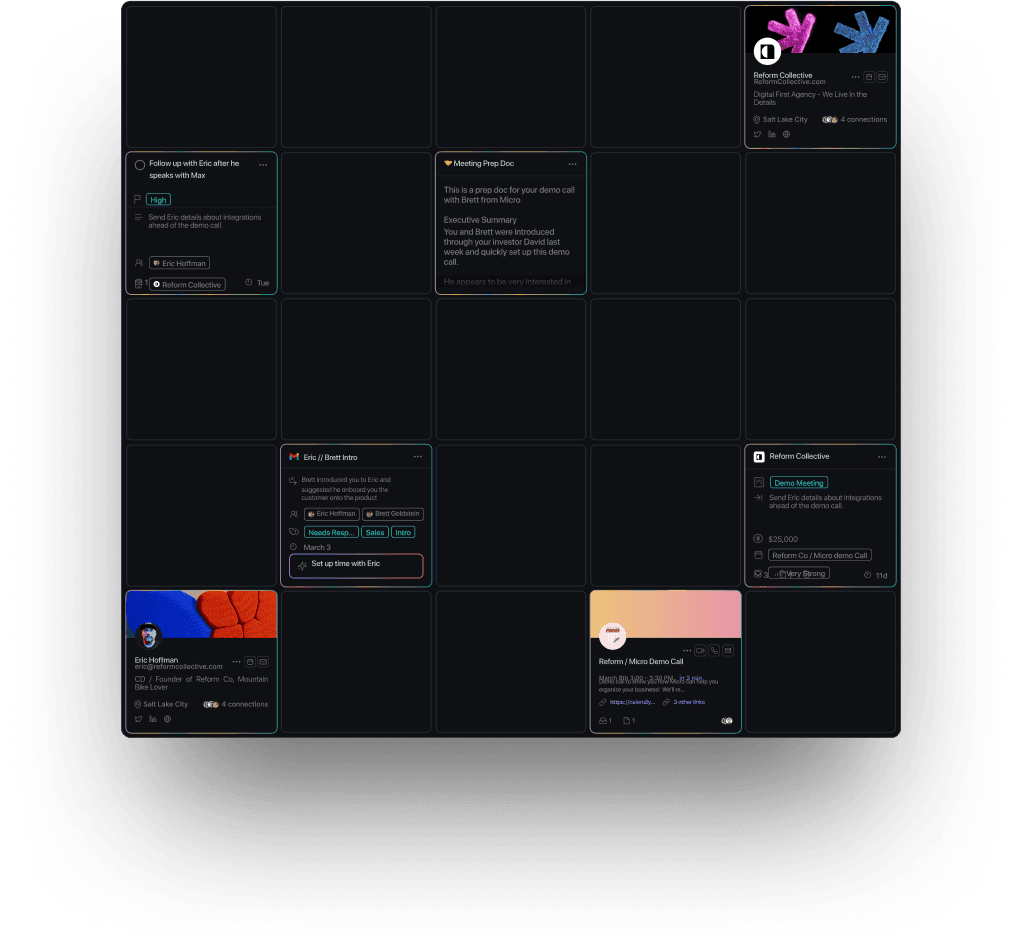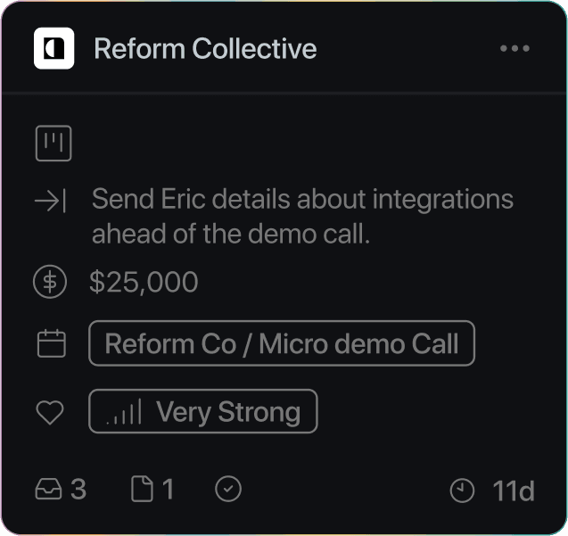 Everything - companies, people, and more - is enriched with hundreds of datapoints from a rich global and personal knowledge graph. Plus any property can be updated automatically when there's new email or meeting activity.